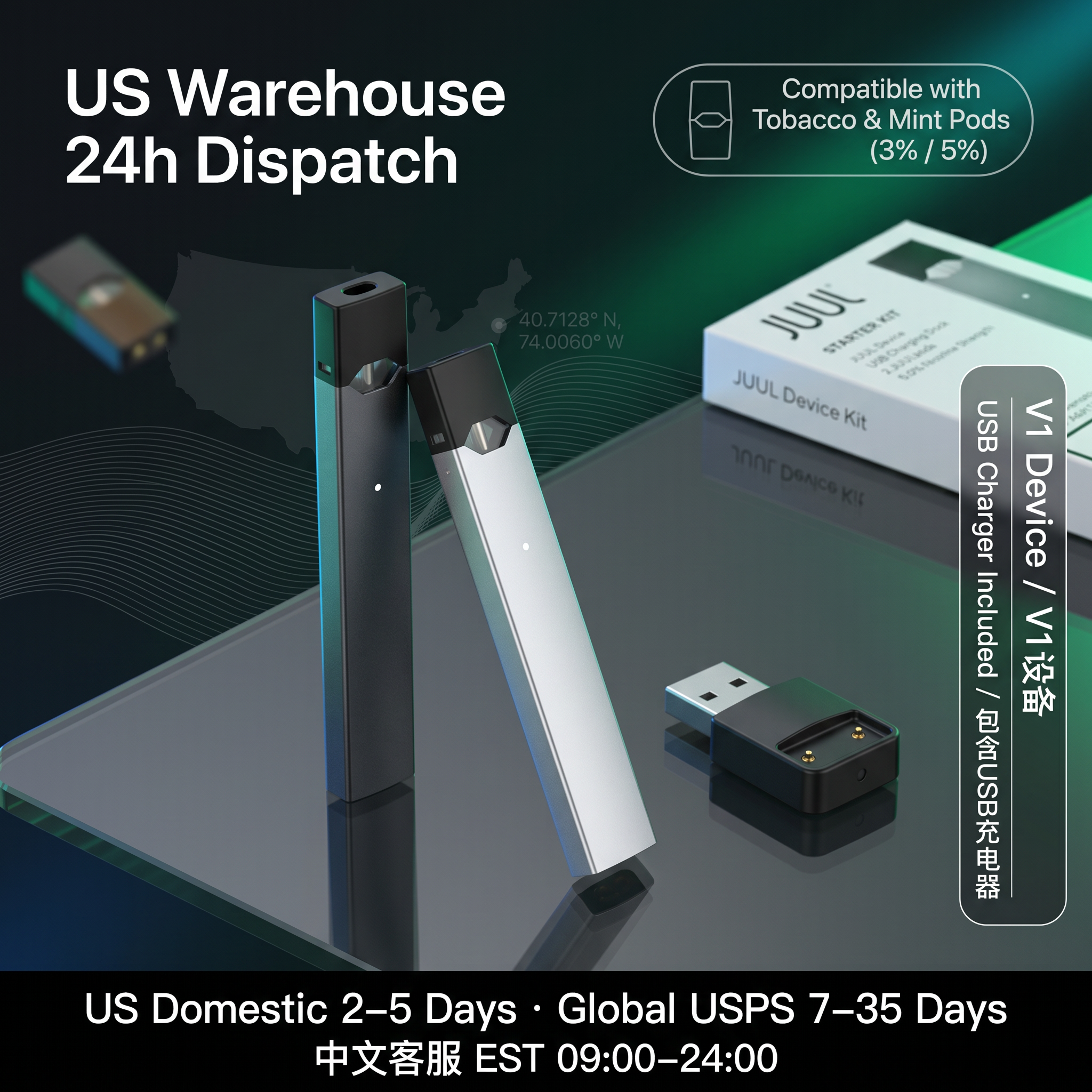 JUUL 主机与烟草/薄荷 Pods 一单齐发,DDP 双清,覆盖墨西哥/巴西/中国大陆口岸。